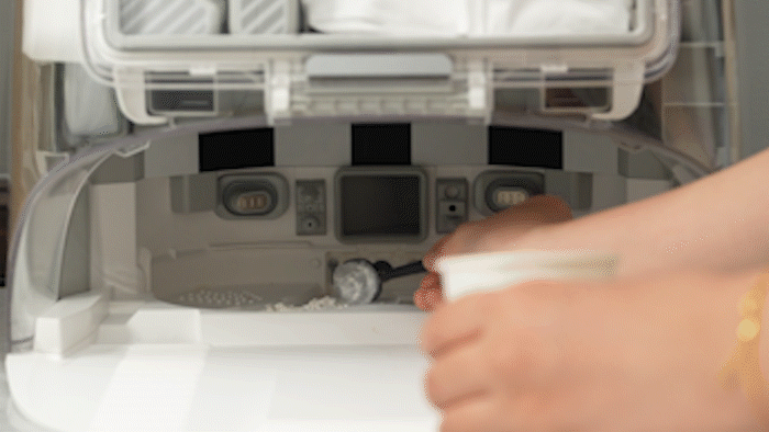 最初,针对基坐的自洁净功能进行了体验,正在洁净底盘的凹槽放置少量头发、面粉跟咖啡粉的夹杂物,随后自洁净,通过四高压水冲刷和超大吸污口可霎时排走污垢,洁净事后的底盘干清洁净,没有污渍和头发残留,让用户无需手动拆洗清理底盘,实正实现解放双手。