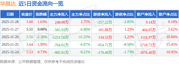 证券之星动静,截至2025年11月28日收盘,华昌达(300278)报收于5。6元,上涨1。63%,换手率1。15%,成交量16。23万手,成交额9030。5万元。11月28日的资金流向数据方面,从力资金净流入248。08万元,占总成交额2。75%,逛资资金净流出257。22万元,散户资金净流入9。14万元,占总成交额0。1%。